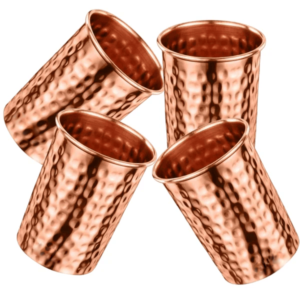 Stay healthy in style with our Set of 4 Ayurvedic Hammered Copper Glasses from IndiCopper. Crafted from 100% pure copper to boost immunity, aid digestion & naturally alkalize water. Ideal for family use or gifting!